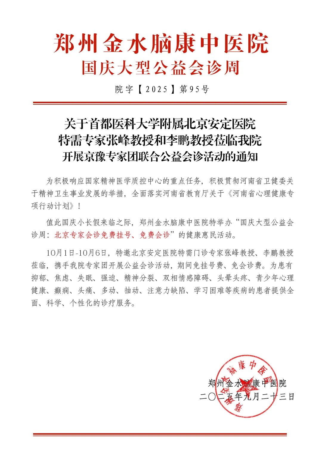 值此国庆小长假来临之际,郑州金水脑康中医院着力解决就医痛点,特举办“国庆大型公益会诊周·京豫专家团联合公益会诊活动”!